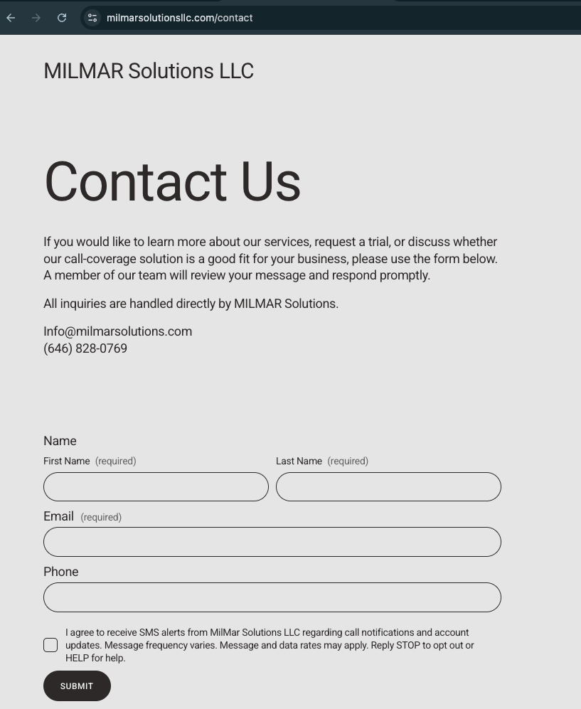 Users may opt in to receive SMS alerts from MilMar Solutions LLC by entering their phone number on our contact form and optionally selecting the SMS consent checkbox.